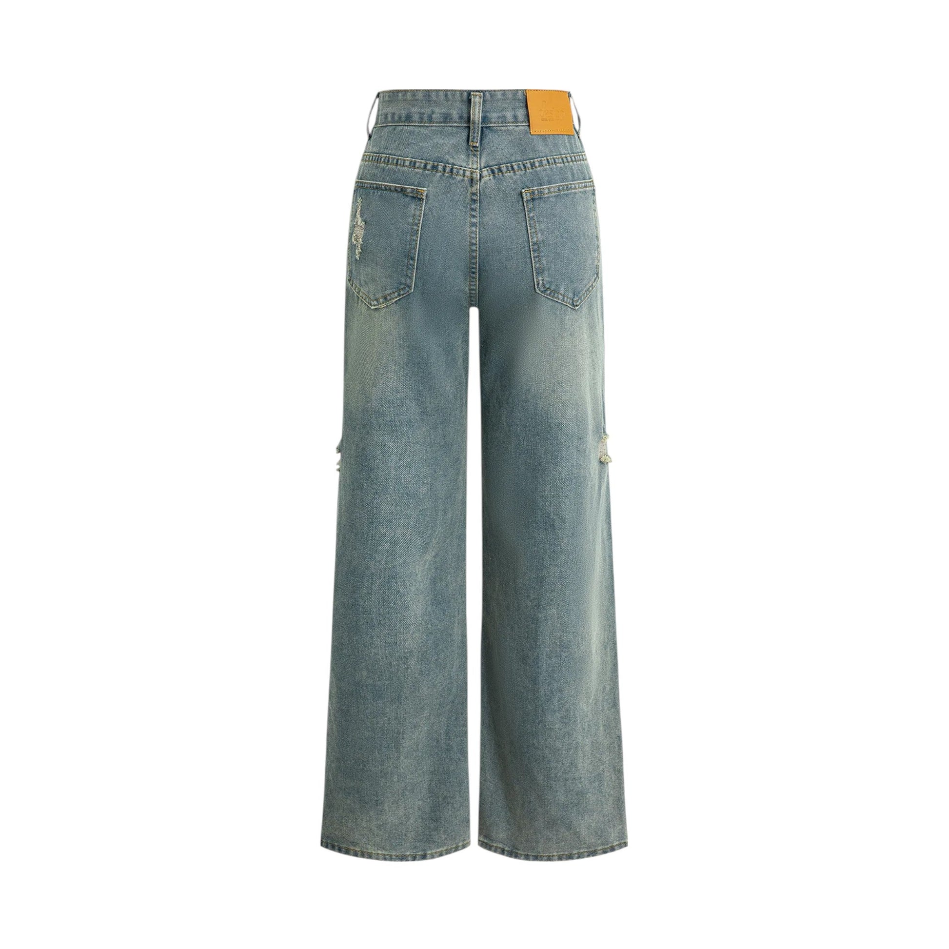 These women’s retro-style jeans feature a bold asymmetrical design with washed denim and distressed rip detailing, offering a standout look for casual occasions. The fitted cut hugs the body through the waist and hips, while the high-rise waist provides a flattering silhouette.